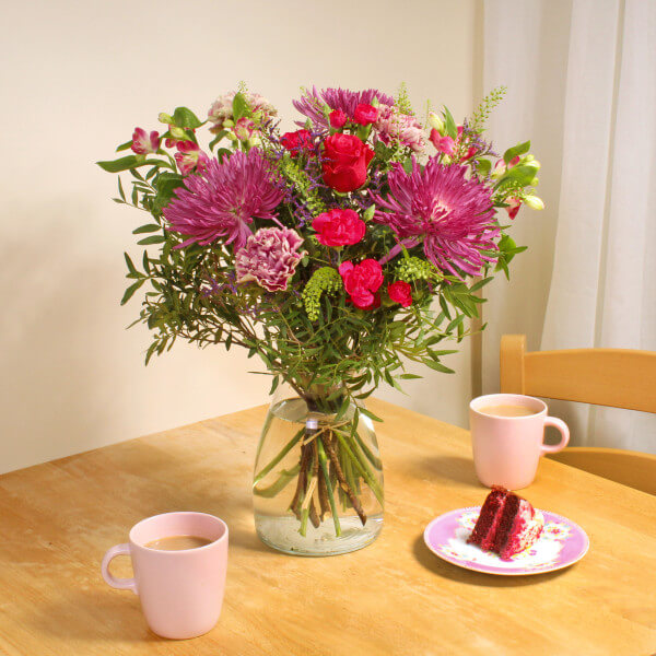 Bring the beauty of Plum Handtied to your doorstep. A delicate and feminine bouquet of purple and pink carnations and chrysanthemums. A gift that is sure to make someone’s day a little sweeter.